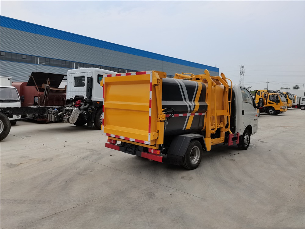 侧装式压缩垃圾车属于自装卸式垃圾车的一种,采用侧提桶上料方式进行生活垃圾收集,采用推板推挤或自卸式进行卸料。主要结构:汽车底盘、垃圾厢体、底架、侧提桶机构、后门总成、推板总成、液压系统和电控系统。液压及电控系统由油泵、油缸、油箱、电液控制阀、PLC和控制开关等组成。同时本车自重轻,箱体为圆弧形,容积大,同等车型中装载量最大,并且美观大方。