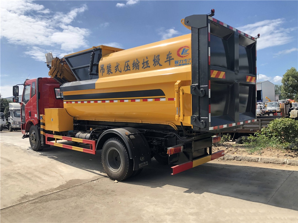 2,最大配12吨吊机,压缩垃圾箱容积12立方,匹配垃圾斗容积3-5立方,装满5-8桶。