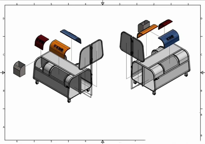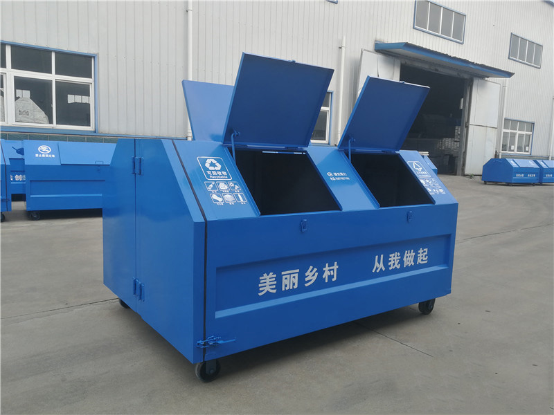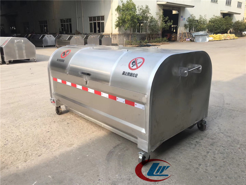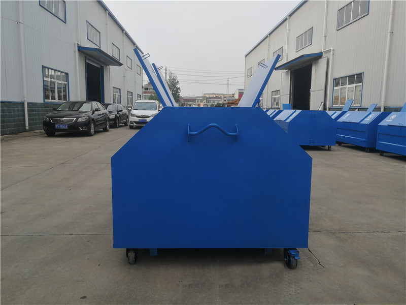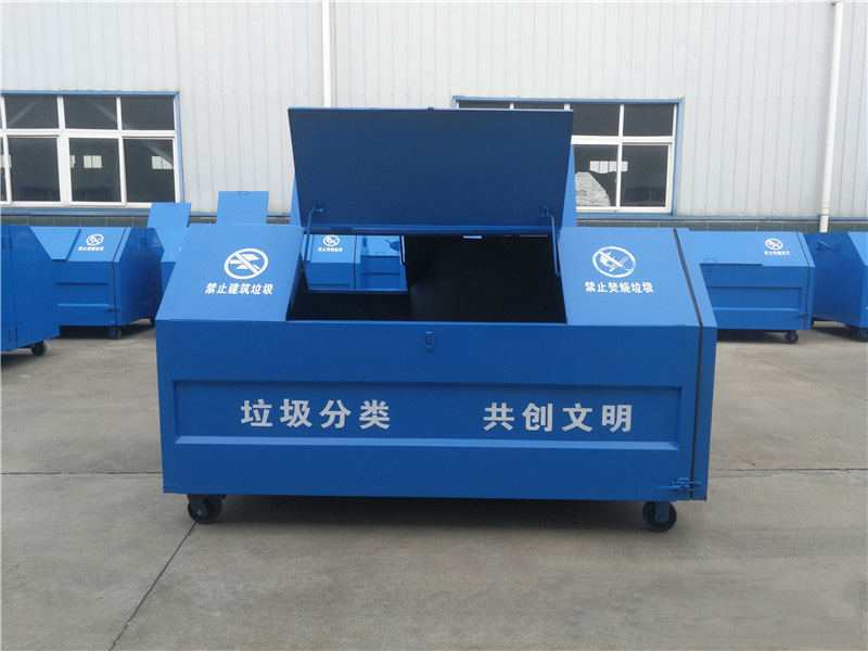 4.箱体Q235碳钢,侧板实际厚度mm:1.8/2.5,垃圾箱前后门主骨架采用50*30*1.5mm厚Q235方管,底部槽钢100*50*2mm矩形方筒,底板采用两根50*30*1.5mm方管及一根锁紧方管(40*40*1.5mm),箱体前挂钩采用3cm直径钢筋