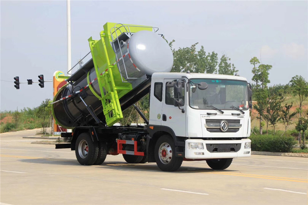 上装配置:罐体采用4mm优质Q345锰板制作,圆形罐体,罐体前后封头采用圆弧蝶形封头,罐体尾端及罐体后封头外加25~30mm厚法兰,罐体与后封头上部采用铰链连接,后封头可利用液压油缸打开卸料;罐体右侧前部装有挂桶提升机构装卸桶装垃圾,挂桶提升机前侧装有圆形液位计;罐体后部两侧安装液压油缸实现罐体举升自卸。后盖采用液压锁紧,室外手动液压操作。