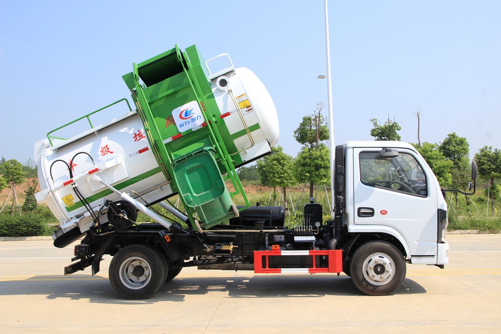 罐体内分上、下两层,下层为固液分离后污水收集箱,污水箱两头高,中间低,最低端设有出水口,以保证污水排放干净,料口及后门为液压密封,上料为提升拉杆式,罐体带举升自卸功能,让排泄更彻底干净。餐厨垃圾车除了单一的运输、收集外,还可选装固液分离装置、吸污功能、罐体清洗功能等。液压系统由泵、液压阀和顺序阀以及各种功能的液压油缸、高低压管路组成。关键部件可选用原装进口,保证产品工作可靠、安全。垃圾投入口与推板之间有足够距离,推板与罐体内表面设有密封装置,避免餐厨垃圾投入过程及分离过程中溢到推板后方。