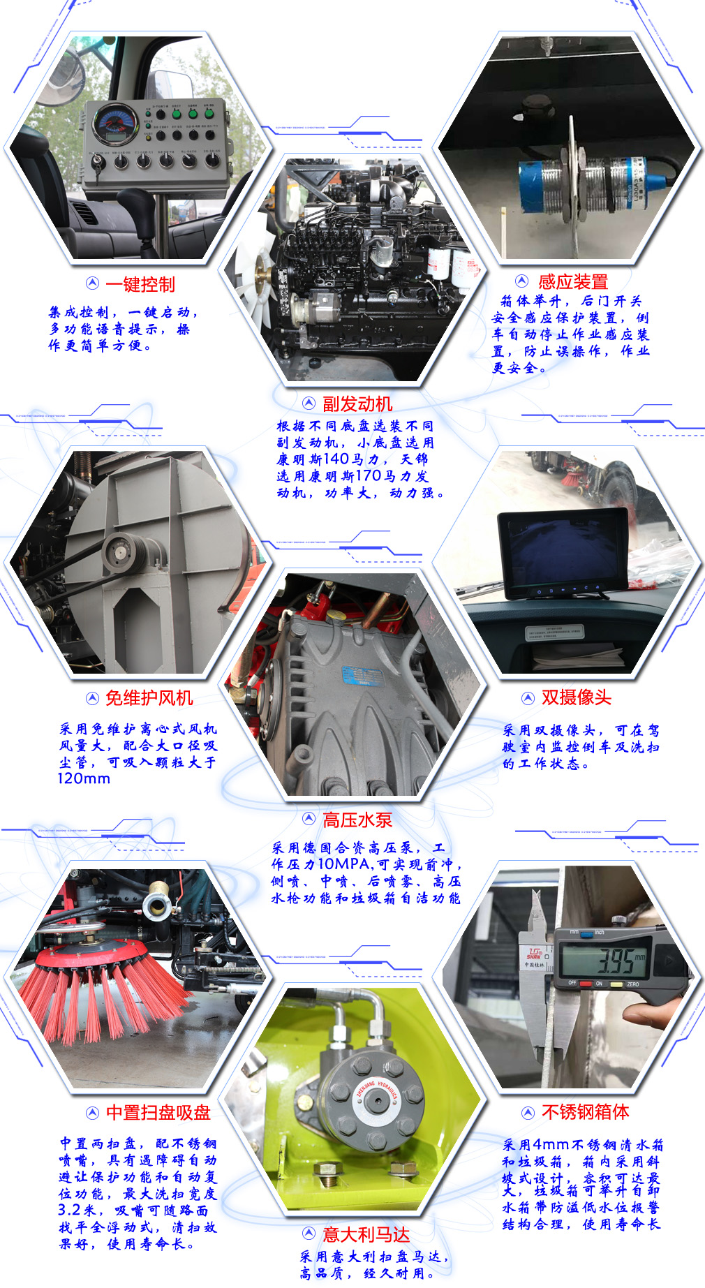 16、可加装前冲、后洒、喷雾、自洁卷盘、作业监控系统、辅助吸管装置、推雪铲等。